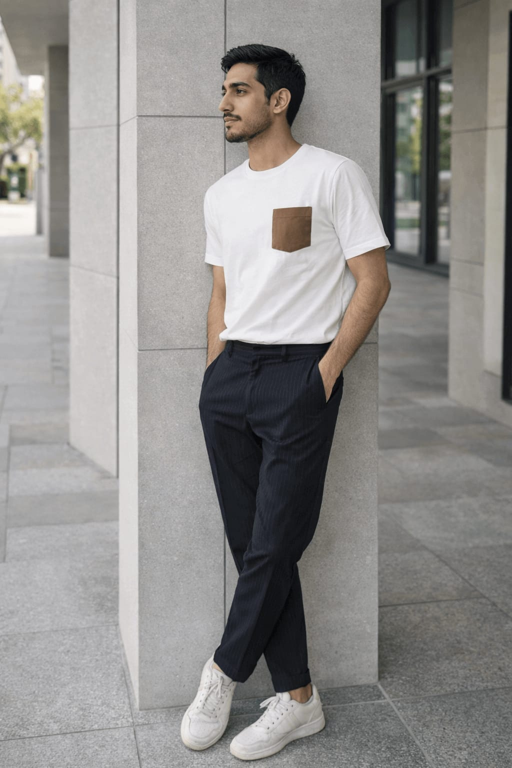 White t-shirt with brown chest pocket, navy pinstripe trousers, light sneakers.