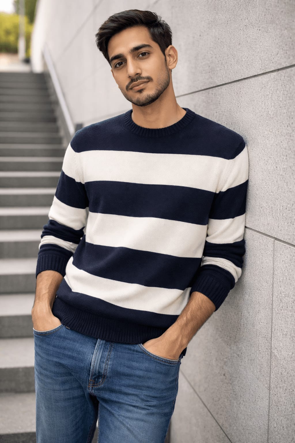 Striped sweaters are timeless. The concrete wall added urban texture.