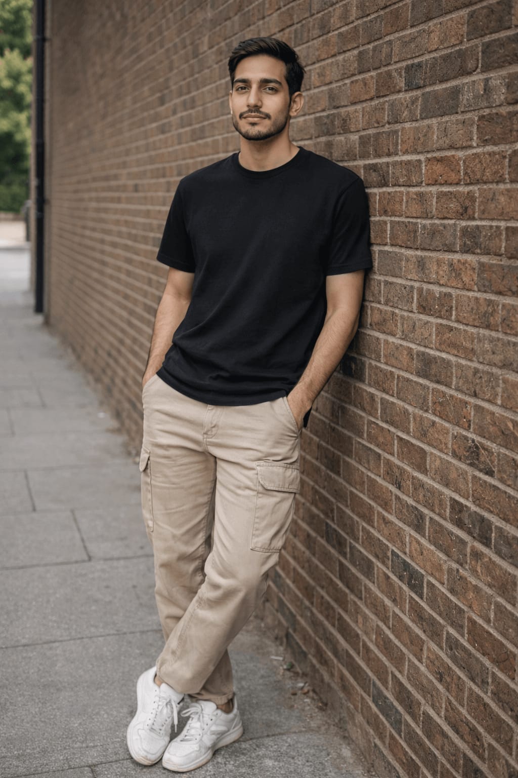 Plain black t-shirt, beige cargo pants, white sneakers.