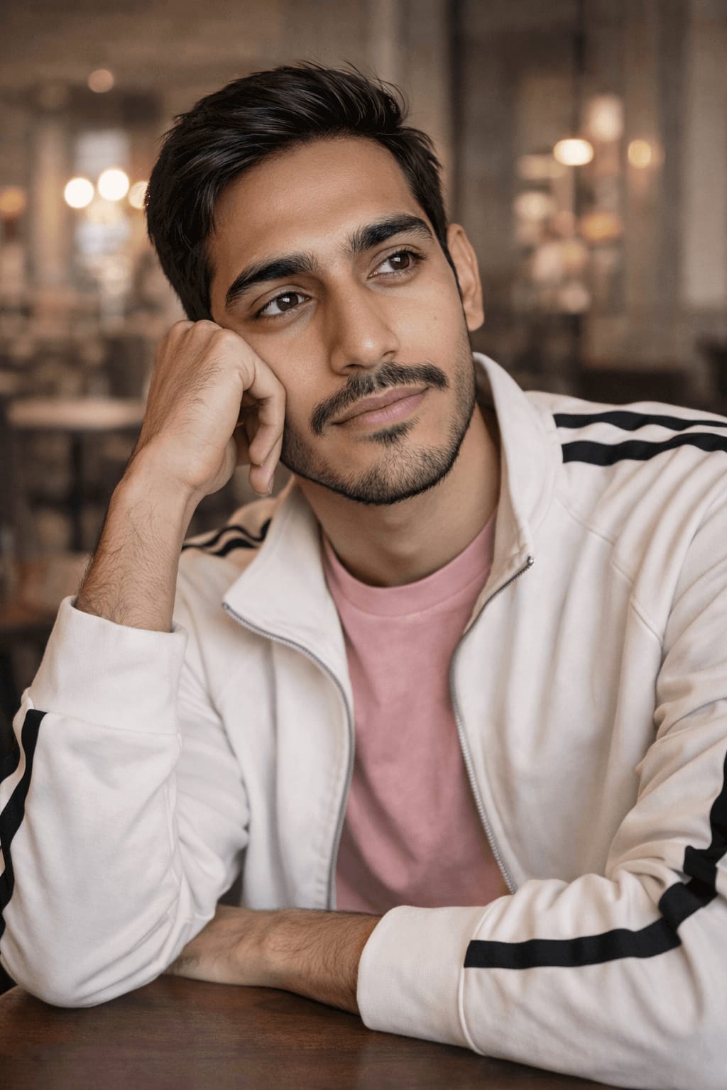Pink t-shirt under white track jacket was unexpected but worked. The thoughtful gaze added depth.