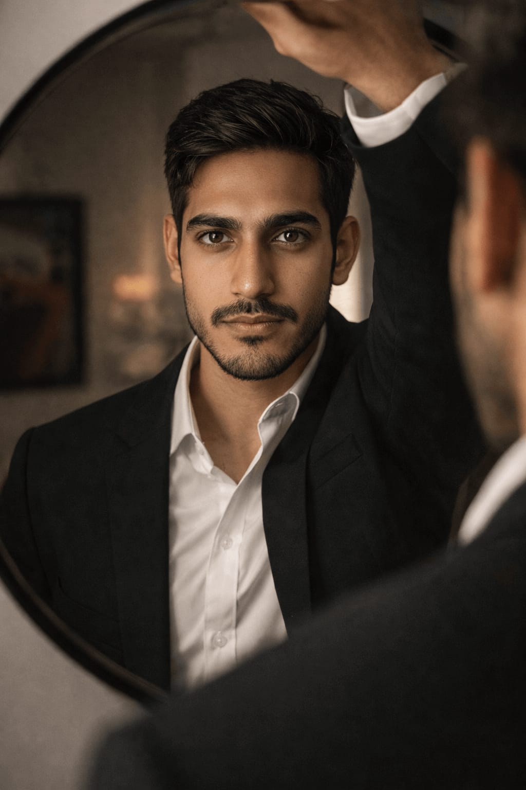 Ultra-realistic indoor mirror fashion portrait using the provided reference image for exact facial identity, bone structure, skin tone, beard shape, eyebrows, and eye shape only.